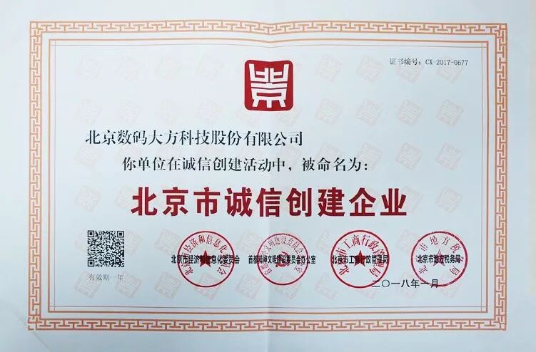 近日,北京市经济和信息化委员会组织公布了2017年北京市企业诚信创建活动成果,数码大方连续获得“北京市诚信创建企业”称号。